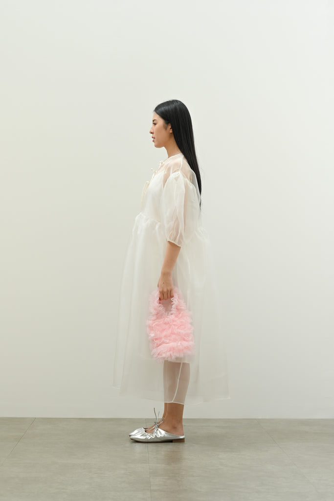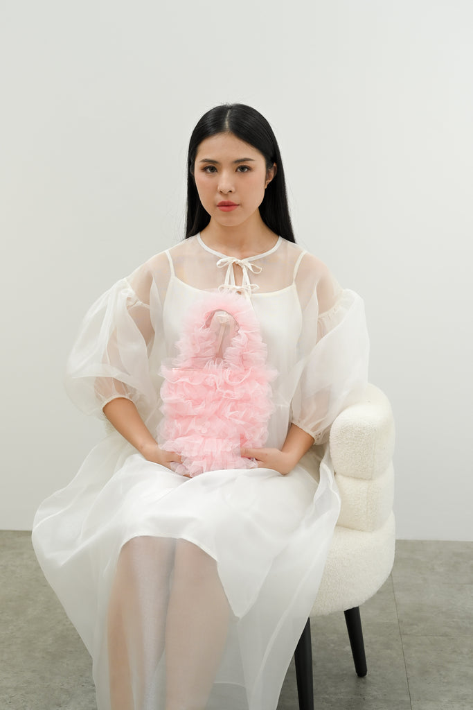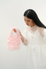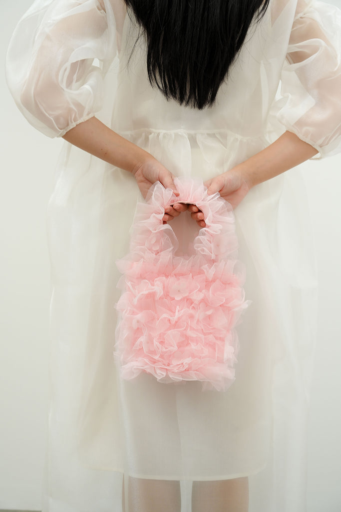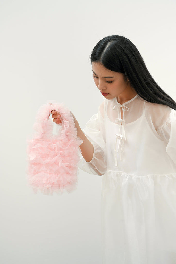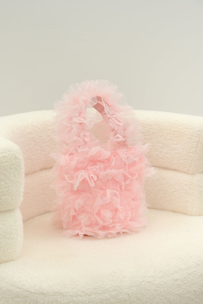 The Ame Pink Mini Handle Bag features a compact top-handle silhouette crafted from layered tulle with structured ruffled detailing. Accented with subtle floral embellishments for a soft, feminine touch. Finished with a secure magnetic closure and a fully lined interior sized for small essentials. Lightweight, charming, and effortless to carry from day to night.